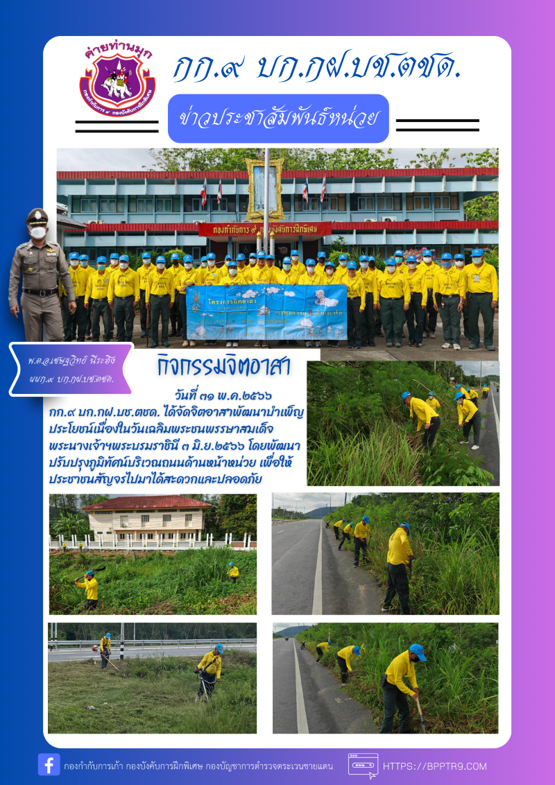 ๕. รายละเอียดกิจกรรม : ภายใต้อำนวยการของ พ.ต.อ.เชษฐวิทย์ นีระฮิง ผกก.๙ บก.กฝ.บช.ตชด. มอบหมายให้ พ.ต.ท.สุชาติ บุปปาจันโท รอง ผกก.๙ บก.กฝ.บช.ตชด.นำกำลังพลข้าราชการตำรวจจิตอาสาของหน่วยจัดกิจกรรมจิตอาสาพัฒนาบำเพ็ญประโยชน์เนื่องในวันเฉลิมพระชนพรรษาสมเด็จพระนางเจ้าฯพระบรมราชินี ๓ มิ.ย.๒๕๖๖ โดยได้ทำกิจกรรมจิตอาสาพัฒนาปรับปรุงภูมิทัศน์บริเวณถนนด้านหน้าหน่วยเพื่อให้ประชาชนสัญจรไปมาได้สะดวกและปลอดภัย ผลการปฏิบัติเป็นไปด้วยความเรียบร้อย
