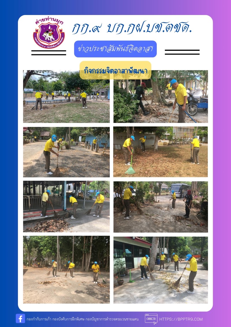 มอบหมายให้ พ.ต.ท.ภูเบศ สกุลโสภณ สว.กก.๙ บก.กฝ.บช.ตชด. นำข้าราชการตำรวจของหน่วยและผู้เข้ารับการฝึกอบรมหลักสูตร กดต. จัดกิจกรรมจิตอาสาพัฒนาบำเพ็ญประโยชน์ ถวายเป็นพระราชกุศล ณ บริเวณวัดสำนักหว้า อ.สะเดา จว.สงขลา ผลการปฏิบัติเรียบร้อย